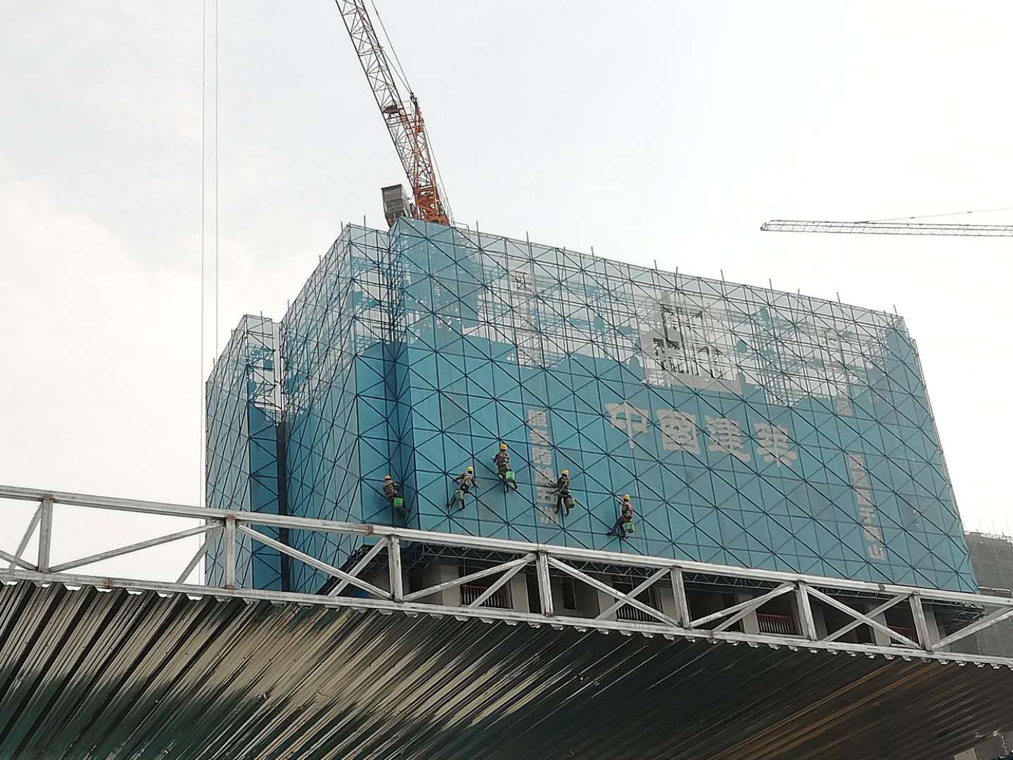 2、吊籃方式 在樓頂架設(shè)吊籃將工人運(yùn)送到指定位置進(jìn)行施工操作。此施工方式清洗效率較低,成本較高。